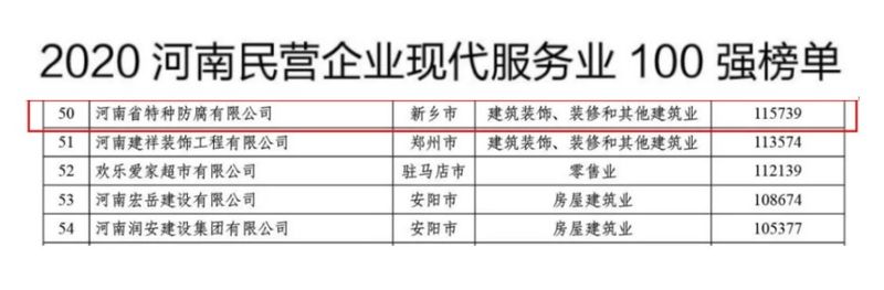 河南省特种防腐有限公司荣获2020河南民营企业现代服务业100强
